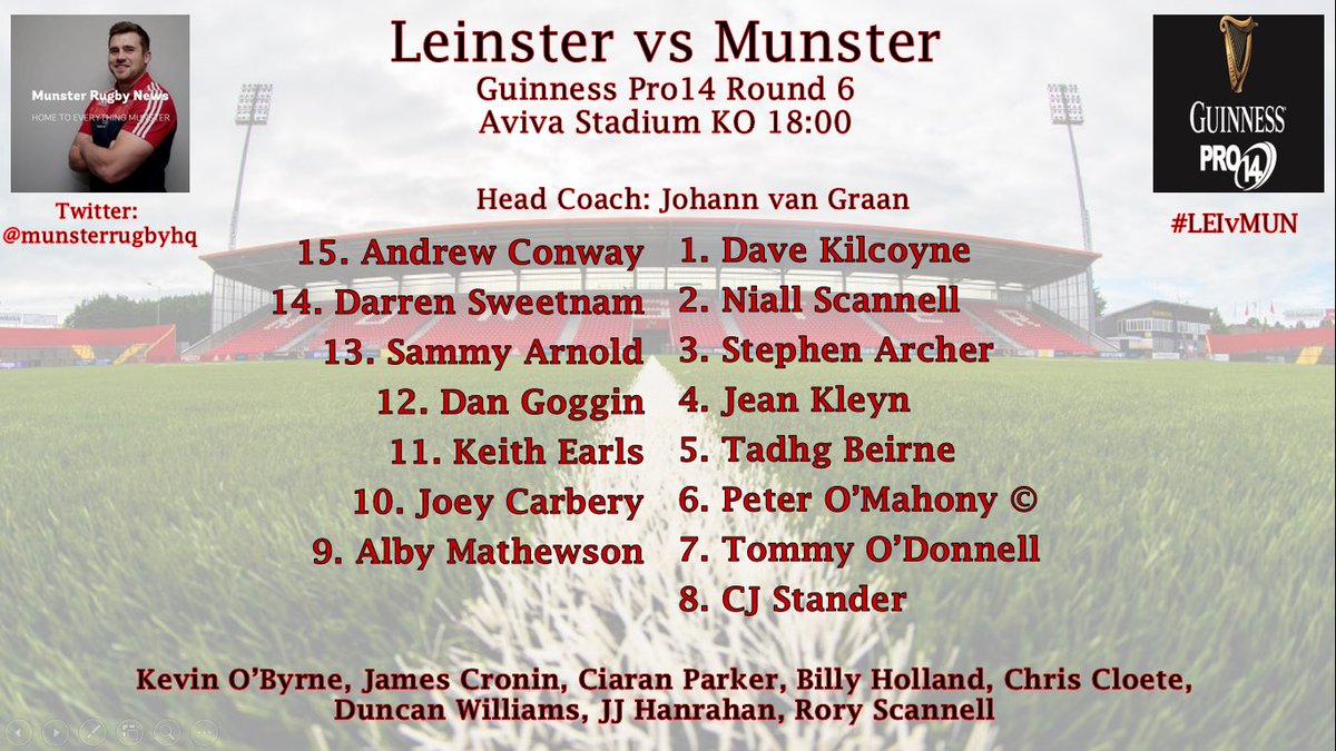 LEINSTER : 15 Rob Kearney, 14 Jordan Larmour, 13 Garry Ringrose, 12 Robbie Henshaw, 11 James Lowe, 10 Johnny Sexton (c), 9 Luke McGrath, 8 ...