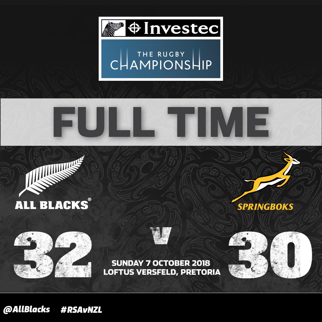 Koch rompe...Siya Kolisi al piso...Ardie Savea recupera...van al touch...line negro..lo lanza Nathan Harris en las 22 verdes..la baja Kieran Read...van en corto con Tim Perry.....Tj.Perenara abre,chocan con Scott Barrett...levanta y es try de @ardiesavea ..convierte Richie Mo unga...Final.