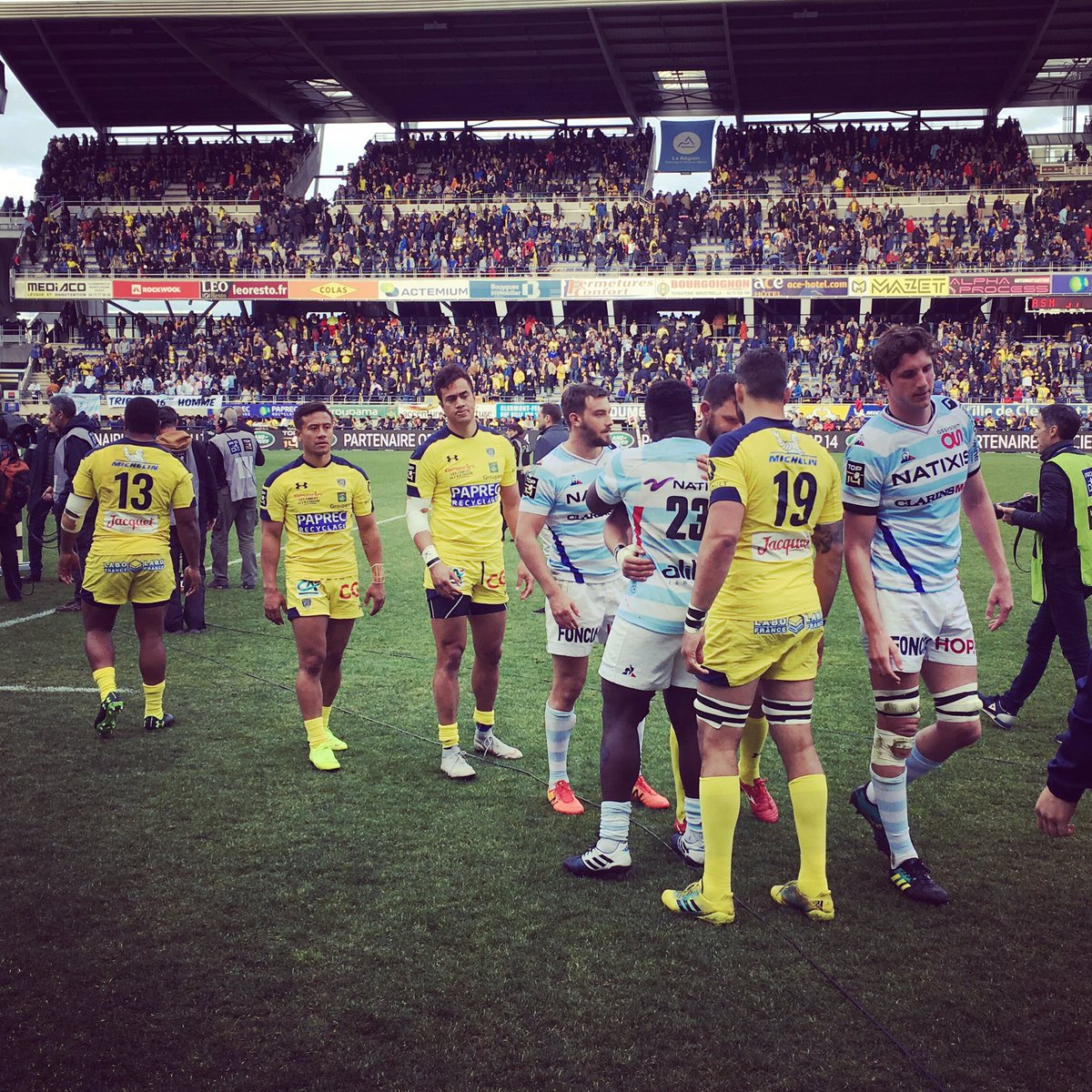En infracción Fischer...Racing dice..al touch..lo lanza Camille Chat...Machenaud la saca rápida..Bird al golpe..Ben Volavola aparece...pase lateral..try de Olivier Klemenczak..no convertido...