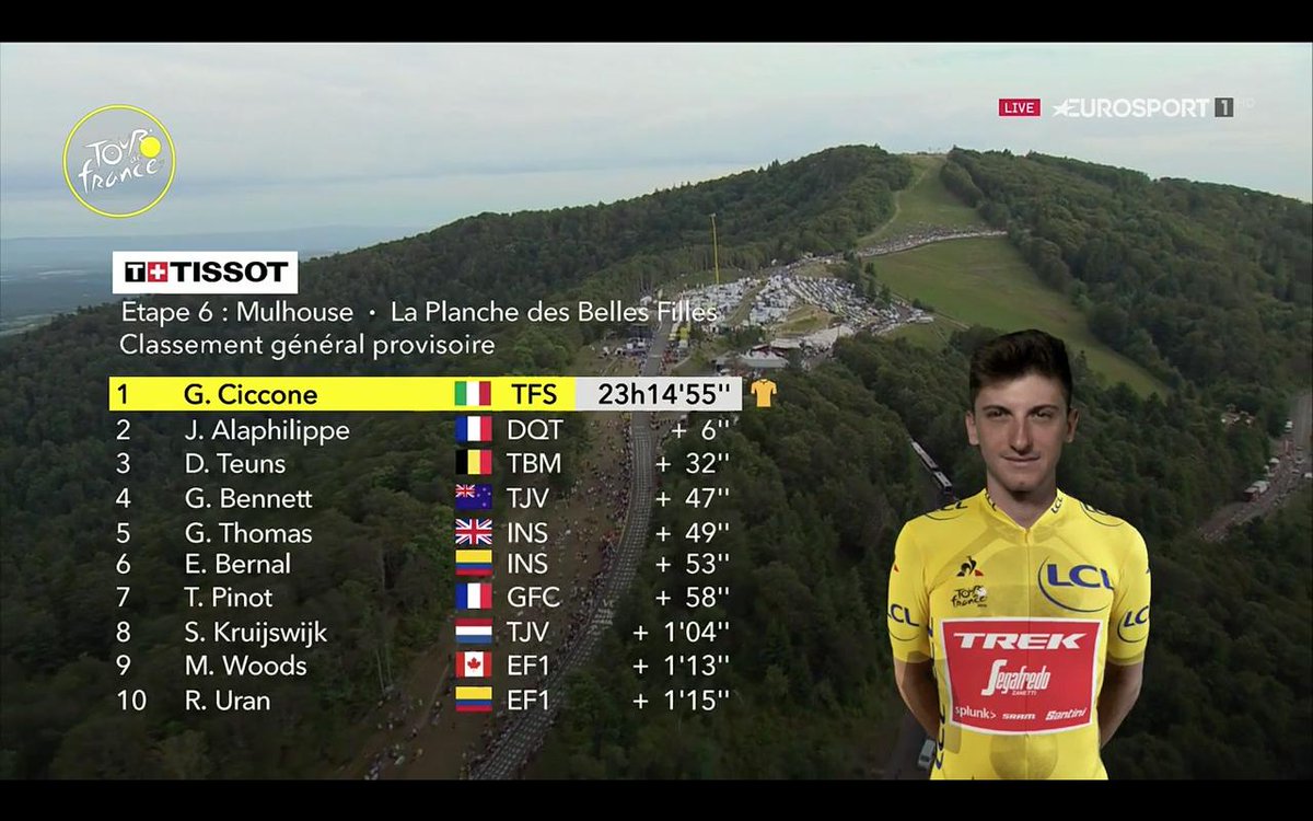 ...Giulio Ciccone es segundo....a 11 segundos....tercero Xandro Meurisse a 1 minuto 05 segundos..Geraint Thomas a 1 minuto 44 segundos...quinto,Pinot...sexto Julian Alaphilippe....a 1 minuto 46 segundos...
